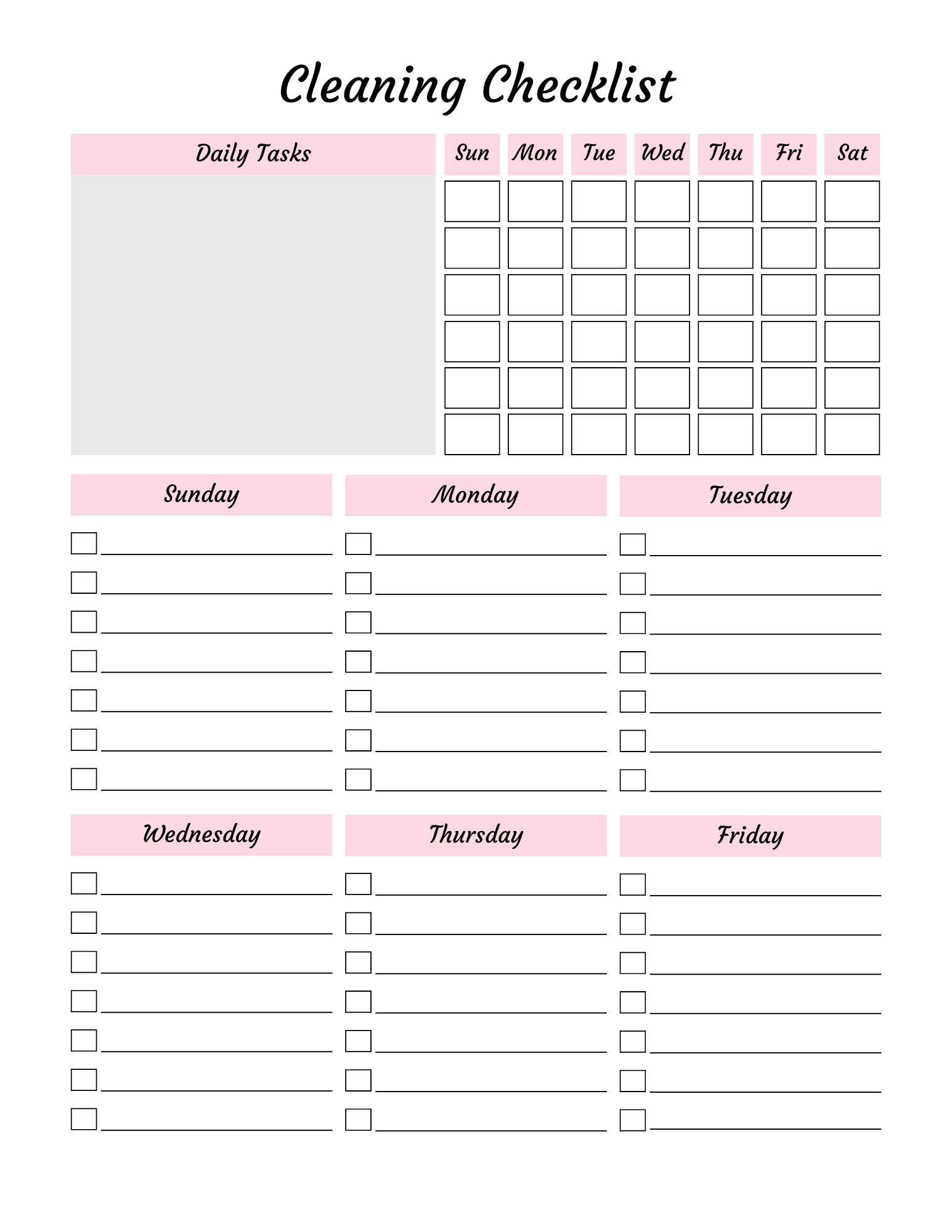 - Daily Cleaning Checklist: Track everyday tasks like sweeping, wiping surfaces and tidying up!